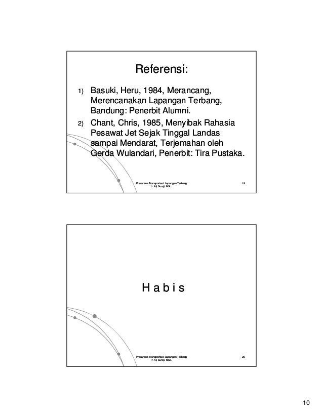 - 10. Referensi:1) Basuki, Heru, 1984, Merancang, Merencanakan L M k Lapangan T bTerbang, Bandung: Penerbit Alumni.2) Chant, Chris, 1985, Menyibak Rahasia Pesawat Jet Sejak Tinggal Landas sampai Mendarat, Terjemahan oleh Gerda Wulandari, Penerbit: Tira Pustaka. Prasarana Transportasi: Lapangan Terbang 19 Ir. Aji Suraji, MSc. Habis Prasarana Transportasi: Lapangan Terbang 20 Ir. Aji Suraji, MSc. 10