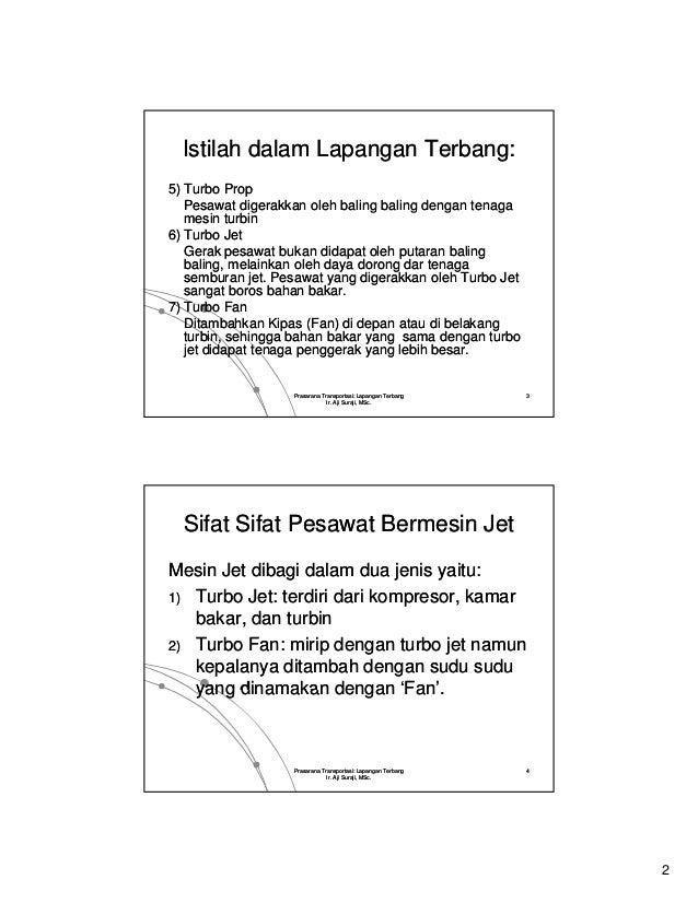 - 2. Istilah dalam Lapangan Terbang:5) Turbo Prop Pesawat digerakkan oleh baling baling dengan tenaga g g g g g mesin turbin6) Turbo Jet Gerak pesawat bukan didapat oleh putaran baling baling, melainkan oleh daya dorong dar tenaga semburan jet. Pesawat yang digerakkan oleh Turbo Jet sangat boros bahan bakar.7) Turbo Fan Ditambahkan Kipas (Fan) di depan atau di belakang turbin, sehingga bahan bakar yang sama dengan turbo jet didapat tenaga penggerak yang lebih besar. Prasarana Transportasi: Lapangan Terbang 3 Ir. Aji Suraji, MSc. Sifat Sifat Pesawat Bermesin JetMesin Jet dibagi dalam dua jenis yaitu:1) Turbo Jet: terdiri dari kompresor, kamar bakar, dan turbin2) Turbo Fan: mirip dengan turbo jet namun kepalanya ditambah dengan sudu sudu yang dinamakan dengan ‘Fan’. Fan Prasarana Transportasi: Lapangan Terbang 4 Ir. Aji Suraji, MSc. 2