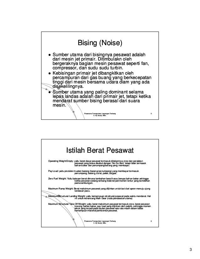 - 3. Bising (Noise) Sumber utama dari bisingnya pesawat adalah dari mesin jet p j primair. Ditimbulakn oleh bergeraknya bagian mesin pesawat seperti fan, compressor, dan sudu sudu turbin. Kebisingan primair jet dibangkitkan oleh percampuran dari gas buang yang berkecepatan tinggi dari mesin bersama udara diam yang ada disekelilingnya. Sumber t S b utama yang paling d i li dominant selama t l lepas landas adalah dari primair jet, tetapi ketika mendarat sumber bising berasal dari suara mesin. Prasarana Transportasi: Lapangan Terbang 5 Ir. Aji Suraji, MSc. Istilah Berat PesawatOperating Weight Empty: yaitu berat dasar pesawat termasuk didalamnya crew dan peralatan pesawat yang biasa disebut dengan ‘No Go Item’ tetapi tidak termasuk bahan bakar dan penumpang/barang yang membayar.Pay Load: yaitu produksi muatan barang (barang/ penumpang) yang membayar termasuk penumpang, barang, surat, paket, bagasi.Zero Fuel Weight: Yaitu batasan berat dimana tambahan berat harus berupa bahan bakar sehingga ketika pesawat sedang terbang tidak terjadi momen lentur yang berlebihan pada sambungan.Maximum Ramp Weight: Berat maksimum pesawat yang diijinkan untuk taxi dari apron menuju ujung landasan pacu.Maximum Structural Landing Weight: yaitu kemampuan struktural pesawat pada waktu mendarat. Hal ini untuk merancang M i G i i t k Main Gear ( d pendaratan utama) (roda d t t )Maximum Structural Take Off Weight: yaitu berat maksimum pesawat termasuk crew, berat pesawat kosong, bahan bakar, pay load yang diijinkan oleh pabrik, sehingga momen tekuk yang terjadi pada badan pesawat rata rata masih dalam batas kemampuan material pembentuk pesawat. Prasarana Transportasi: Lapangan Terbang 6 Ir. Aji Suraji, MSc. 3