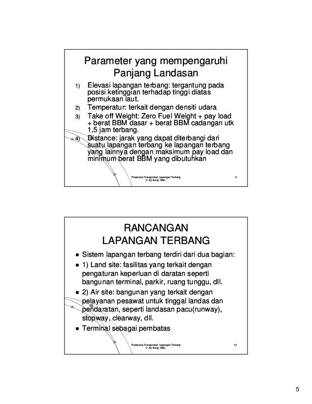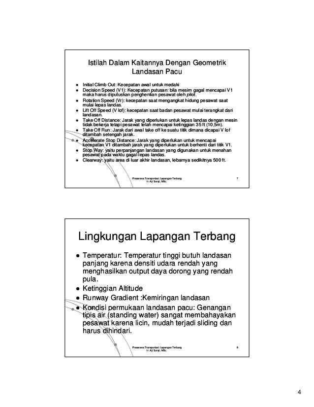 - 4. Istilah Dalam Kaitannya Dengan Geometrik Landasan PacuInitial Climb Out: Kecepatan awal untuk medakiDecision Speed (V1): Kecepatan putusan: bila mesim gagal mencapai V1maka harus diputuskan penghentian pesawat oleh pilot.Rotation Speed (Vr): kecepatan saat mengangkat hidung pesawat saatmulai lepas landas.Lift Off Speed (V lof): kecepatan saat badan pesawat mulai terangkat darilandasan.Take Off Distance: Jarak yang diperlukan untuk lepas landas dengan mesintidak bekerja tetapi pesawat telah mencapai ketinggian 35 ft (10,5m).Take Off Run: Jarak dari awal take off ke suatu titik dimana dicapai V lofditambah setengah jarak.Accelerate Stop Distance: Jarak y g diperlukan untuk mencapai p yang p pkecepatan V1 ditambah jarak yang diperlukan untuk berhenti dari titik V1.Stop Way: yaitu perpanjangan landasan yang digunakan untuk menahanpesawat pada waktu gagal lepas landas.Clearway: yaitu area di luar akhir landasan, lebarnya sedikitnya 500 ft. Prasarana Transportasi: Lapangan Terbang 7 Ir. Aji Suraji, MSc.Lingkungan Lapangan TerbangTemperatur: Temperatur tinggi butuh landasanpanjang karena densiti udara rendah yangmenghasilkan output daya dorong yang rendahpula.Ketinggian AltitudeRunway Gradient :Kemiringan landasanKondisi permukaan landasan p p pacu: Genangan gtipis air (standing water) sangat membahayakanpesawat karena licin, mudah terjadi sliding danharus dihindari. Prasarana Transportasi: Lapangan Terbang 8 Ir. Aji Suraji, MSc. 4