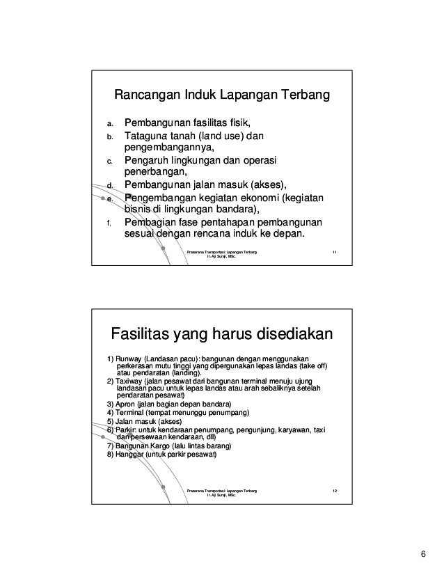 - 6. Rancangan Induk Lapangan Terbanga. Pembangunan fasilitas fisik,b.b Tataguna tanah (land use) dan pengembangannya,c. Pengaruh lingkungan dan operasi penerbangan,d. Pembangunan jalan masuk (akses),e. Pengembangan kegiatan ekonomi (kegiatan bisnis di lingkungan bandara),f. Pembagian fase pentahapan pembangunan sesuai dengan rencana induk ke depan. Prasarana Transportasi: Lapangan Terbang 11 Ir. Aji Suraji, MSc. Fasilitas yang harus disediakan1) Runway (Landasan pacu): bangunan dengan menggunakan perkerasan mutu tinggi yang dipergunakan lepas landas (take off) atau pendaratan (landing). (landing)2) Taxiway (jalan pesawat dari bangunan terminal menuju ujung landasan pacu untuk lepas landas atau arah sebaliknya setelah pendaratan pesawat)3) Apron (jalan bagian depan bandara)4) Terminal (tempat menunggu penumpang)5) Jalan masuk (akses)6) Parkir: untuk kendaraan penumpang, pengunjung, karyawan, taxi dan persewaan kendaraan, dll)7) Bangunan Kargo (lalu lintas barang)8) Hanggar (untuk parkir pesawat) Prasarana Transportasi: Lapangan Terbang 12 Ir. Aji Suraji, MSc. 6