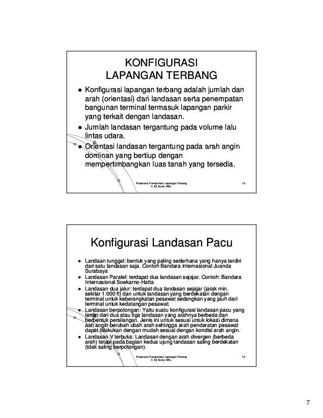 - 7. KONFIGURASI LAPANGAN TERBANGKonfigurasi lapangan terbang adalah jumlah danarah (orientasi) dari landasan serta penempatanbangunan terminal termasuk lapangan parkiryang terkait dengan landasan.Jumlah landasan tergantung pada volume lalulintas udara.Orientasi landasan tergantung pada arah angindominan yang bertiup denganmempertimbangkan luas tanah yang tersedia. Prasarana Transportasi: Lapangan Terbang 13 Ir. Aji Suraji, MSc. Konfigurasi Landasan PacuLandaan tunggal: bentuk yang paling sederhana yang hanya terdiridari satu landasan saja. Contoh Bandara Internasional JuandaSurabayaLandasan Paralel: terdapat dua landasan sejajar. Contoh: BandaraInternasional Soekarno-Hatta Soekarno-Landasan dua jalur: terdapat dua landasan sejajar (jarak min.sekitar 1.000 ft) dan untuk landasan yang berdekatan denganterminal untuk keberangkatan pesawat sedangkan yang jauh dariterminal untuk kedatangan pesawat.Landasan berpotongan: Yaitu suatu konfigurasi landasan pacu yangterdiri dari dua atau tiga landasan yang arahnya berbeda danberbentuk persilangan. Jenis ini untuk sesuai untuk lokasi dimana persilanganaah angin berubah ubah arah sehingga arah pendaratan pesawatdapat dilakukan dengan mudah sesuai dengan kondisi arah angin.Landasan V terbuka: Landasan dengan arah divergen (berbedaarah) tetapi pada bagian kedua ujung landasan saling berdekatan(tdak saling berpotongan). Prasarana Transportasi: Lapangan Terbang 14 Ir. Aji Suraji, MSc. 7