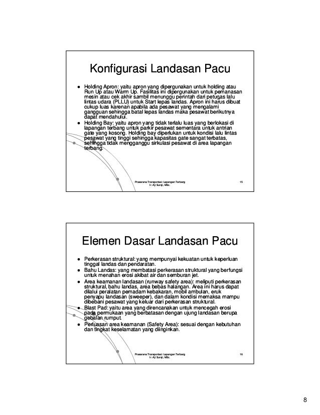 - 8. Konfigurasi Landasan PacuHolding Apron: yaitu apron yang dipergunakan untuk holding atauRun Up atau Warm Up. Fasilitas ini dipergunakan untuk pemanasanmesin atau cek akhir sambil menunggu perintah dari petugas lalulintas udara (PLLU) untuk Start lepas landas. Apron ini harus dibuatcukup luas karenan apabila ada pesawat yang mengalamigangguan sehingga batal lepas landas maka pesawat berikutnyadapat mendahului.Holding Bay: yaitu apron yang tidak terlalu luas yang berlokasi dilapangan terbang untuk parkir pesawat sementara untuk antriangate yang kosong. Holding bay diperlukan untuk kondisi lalu lintaspesawat yang tinggi sehingga kapasitas gate sangat terbatas,sehingga tidak mengganggu sirkulasi pesawat di area lapanganterbang. Prasarana Transportasi: Lapangan Terbang 15 Ir. Aji Suraji, MSc.Elemen Dasar Landasan PacuPerkerasan struktural: yang mempunyai kekuatan untuk keperluantinggal landas dan pendaratan.Bahu Landas: yang membatasi perkerasan struktural yang berfungsiuntuk menahan erosi akibat air dan semburan jet.Area keamanan landasan (runway safety area): meliputi perkerasanstruktural, bahu landas, area bebas halangan. Area ini harus dapatdilalui peralatan pemadam kebakaran, mobil ambulan, erukpenyapu landasan (sweeper), dan dalam kondisi memaksa mampudibebani pesawat yang keluar dari perkerasan struktural.Blast Pad: yaitu area yang direncanakan untuk mencegah erosipada permukaan yang berbatasan dengan ujung landasan berupagebalan rumput. rumputPerluasan area keamanan (Safety Area): sesuai dengan kebutuhandan tingkat keselamatan yang diinginkan. Prasarana Transportasi: Lapangan Terbang 16 Ir. Aji Suraji, MSc. 8