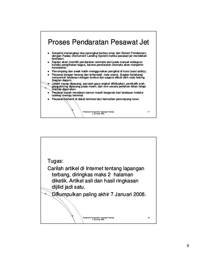 - 9. Proses Pendaratan Pesawat Jet Autopilot menangkap dua perangkat berkas sinar dari Sistem Pendaratan dengan Radas (Instrument Landing System) ketika pesawat jet mendekati landasan. Kapten akan memilih pendaratan otomatis dari pada manual walaupun kondisi penglihatan bagus, karena pendaratan otomatis akan menjamin konsistensi. Penumpang dan awak kabin menggunakan pengikat di kursi (seat safety). Pesawat dengan tenang dan terkendali, roda utama (bagian belakang) menyentuh landasan dengan lembut dan segera diikuti oleh roda hidung (bagian depan). Jelabir sayap dipasang, perusak gaya angkat dihidupkan, pembalik arah gaya dorong dipasang pada mesin, dan rem secara perlahan lahan tetapi mantap digunakan digunakan. Pesawat sudah mendarat namun masih bergerak dari landasan melalui taxiway menuju terminal. Pesawat berhenti di dekat terminal dan kemudian penumpang turun. Prasarana Transportasi: Lapangan Terbang 17 Ir. Aji Suraji, MSc.Tugas:Carilah artikel di Internet tentang lapangan terbang, diringkas maks 2 halaman diketik. Artikel asli dan hasil ringkasan dijilid jadi satu. Dikumpulkan paling akhir 7 Januari 20082008. Prasarana Transportasi: Lapangan Terbang 18 Ir. Aji Suraji, MSc. 9